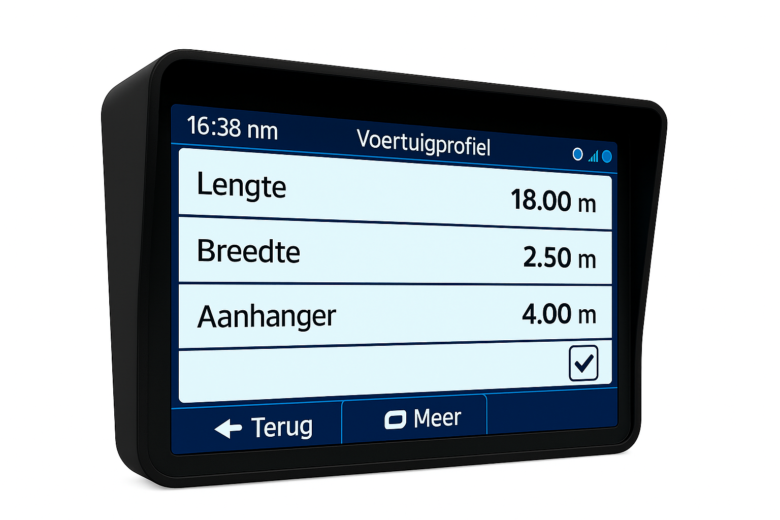 Voertuiginstellingen voor Auto, Camper, Bus & Truck: lengte, breedte, hoogte, gewicht, aantal assen, traileropties, type lading (o.a. gas, ADR-gevaarlijke stoffen, explosieven)