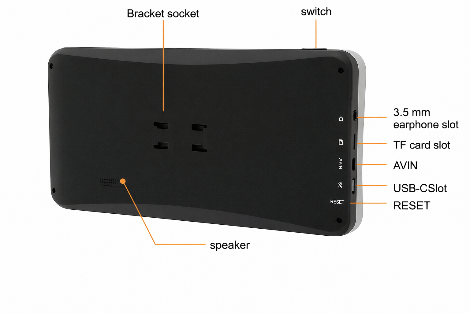9” HD touchscreen (800 × 480) met vast zonnescherm