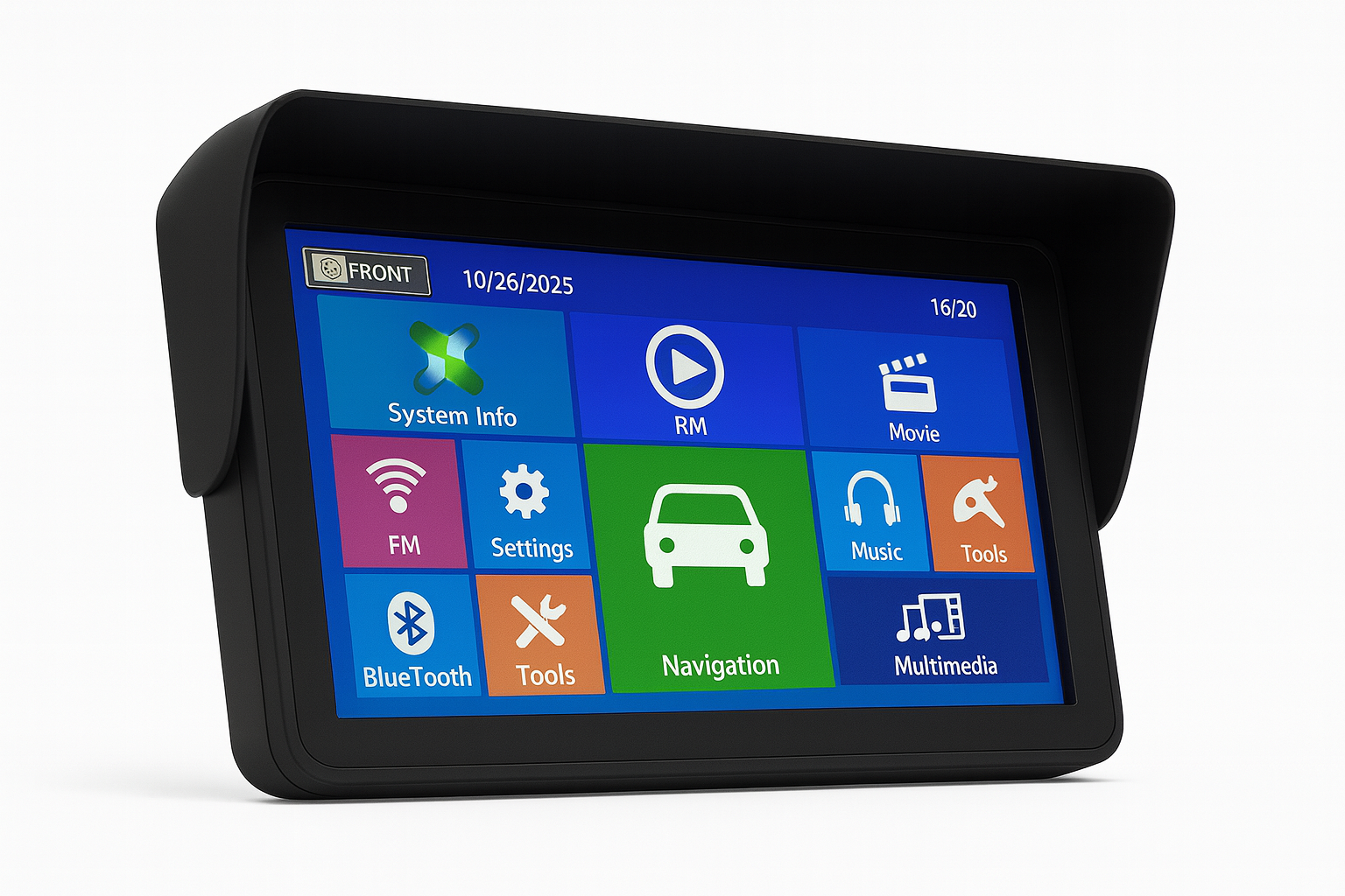 Écran tactile HD 7" (800×480) avec pare-soleil fixe – moins de reflets, idéal pour camping-cars et caravanes