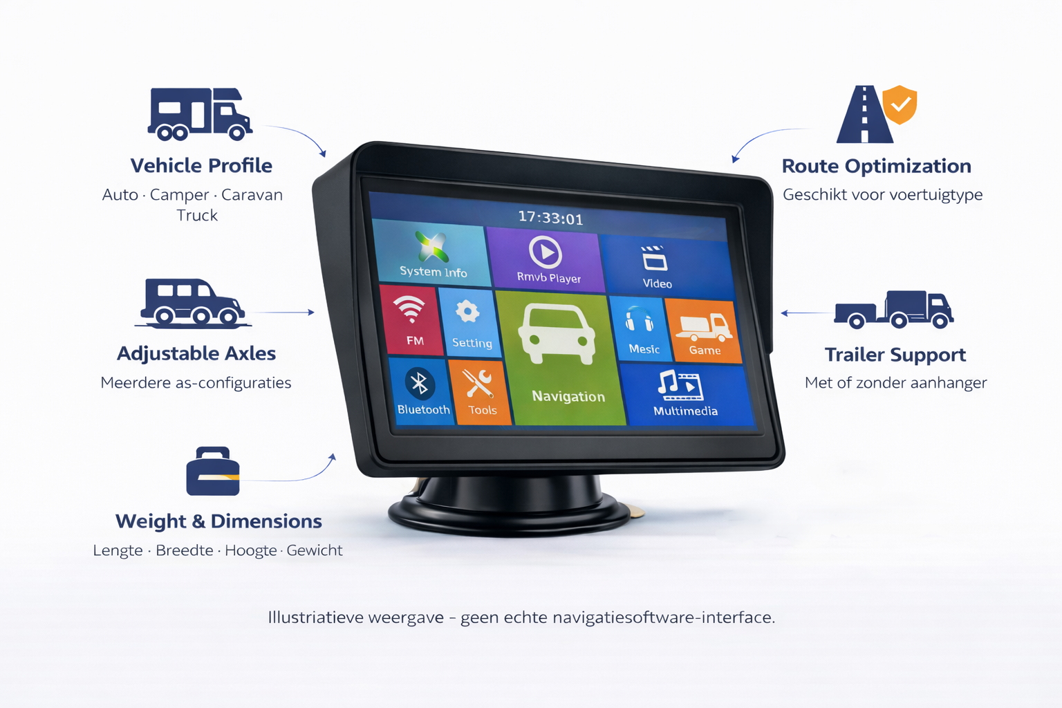 Scherm: 9” HD touchscreen (800 × 480) met vast zonnescherm