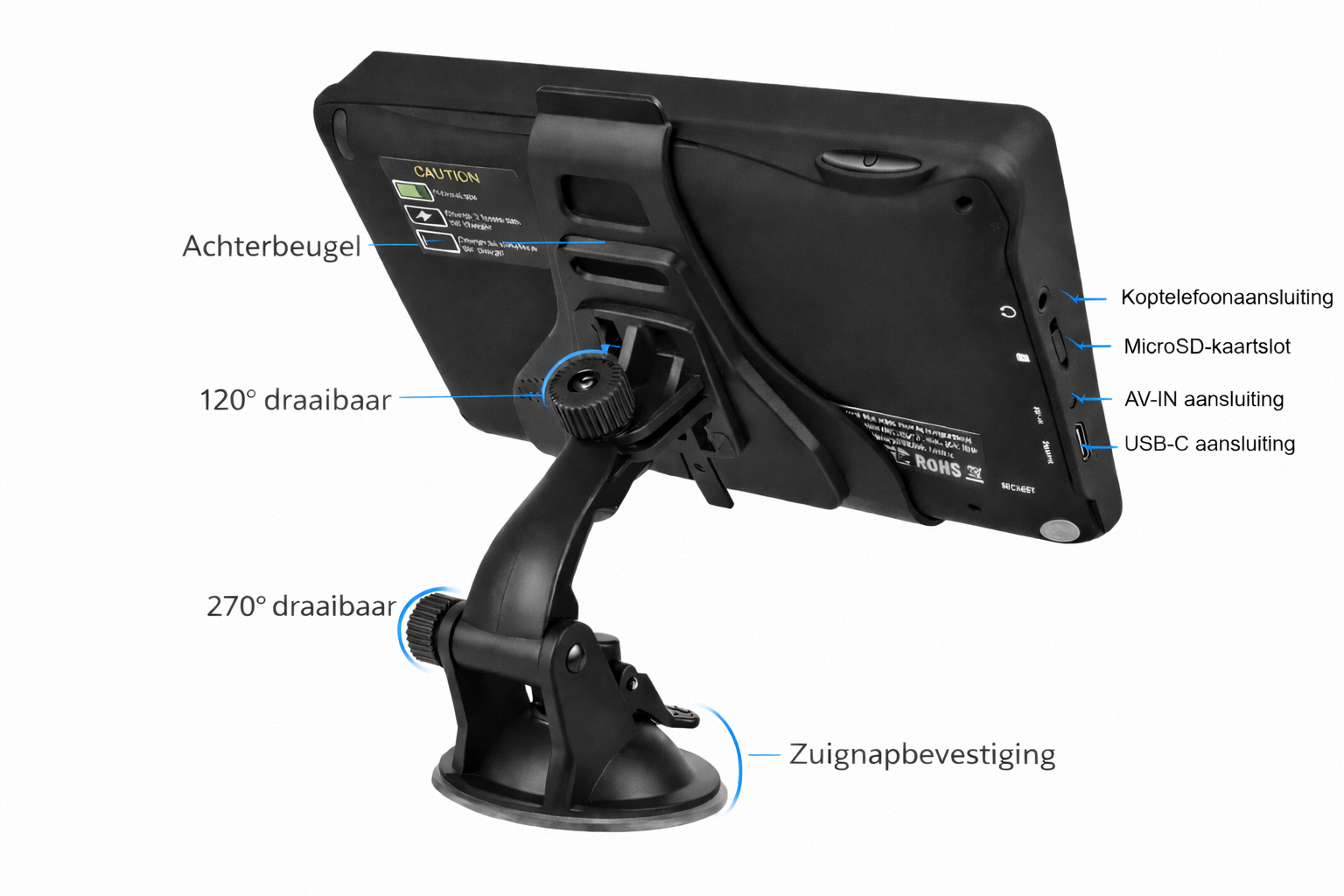 7” HD touchscreen (800×480) met vast zonnescherm – minder reflectie