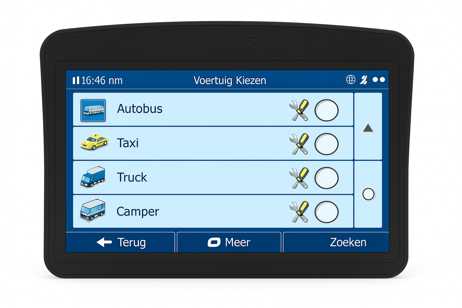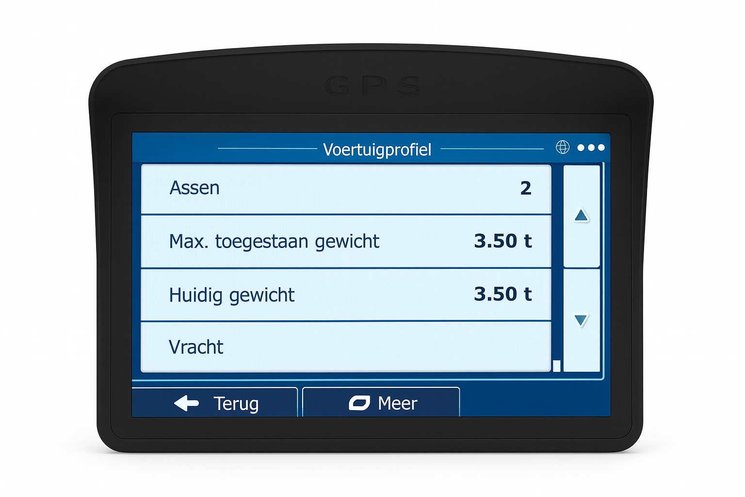 Voertuiginstellingen: lengte, breedte, hoogte, gewicht, assen, met/zonder trailer, type lading (gas, gevaarlijke stoffen, enz.)
