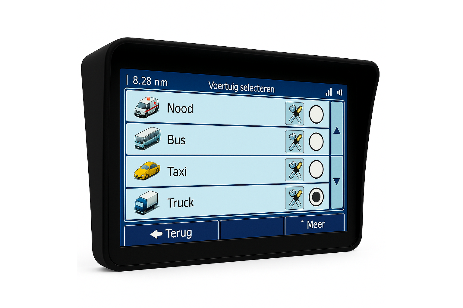 Voertuiginstellingen voor Auto, Camper, Bus & Truck: lengte, breedte, hoogte, gewicht, aantal assen, traileropties, type lading (o.a. gas, ADR-gevaarlijke stoffen, explosieven)