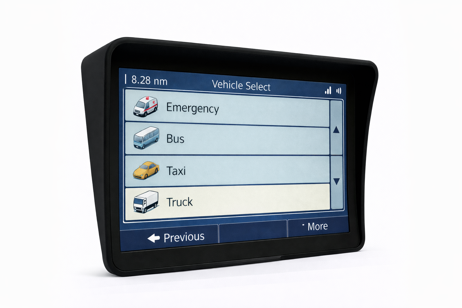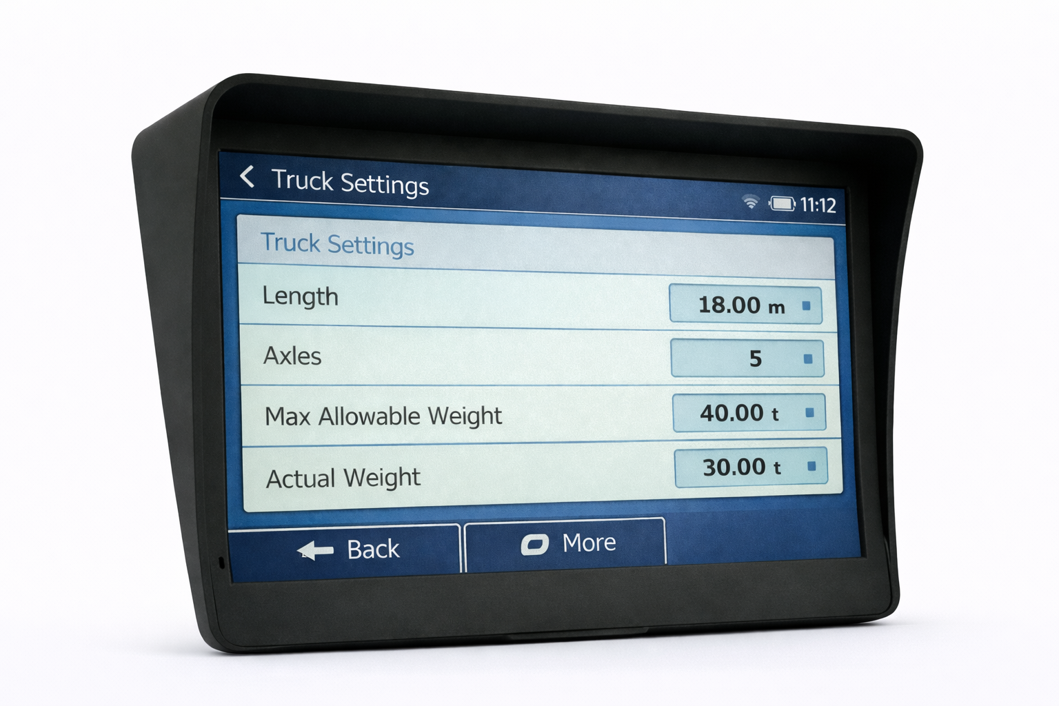 Uitgebreide voertuiginstellingen – lengte, breedte, hoogte, gewicht, assen, met of zonder aanhanger en type lading (afhankelijk van kaartgegevens en gebruikersinstellingen).